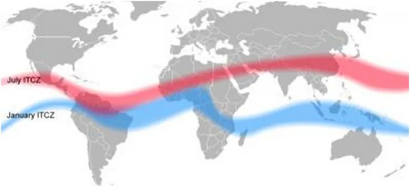 在夏季,地球的热带雨带(红色部分)从冬季位置(蓝色部分)向北迁移。研究人员认为,这种变化在气候变暖的情况下可能会变得更加明显,扰乱降雨模式,并将干旱引入新的地区。(马茨·哈尔丁)