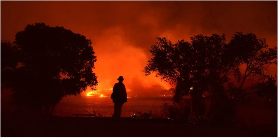 顶部图片:今年六月,强大火灾在加利福尼亚安吉利斯国家森林中燃烧,正值干旱加剧的野火季节。(Gene Blevins/路透社)