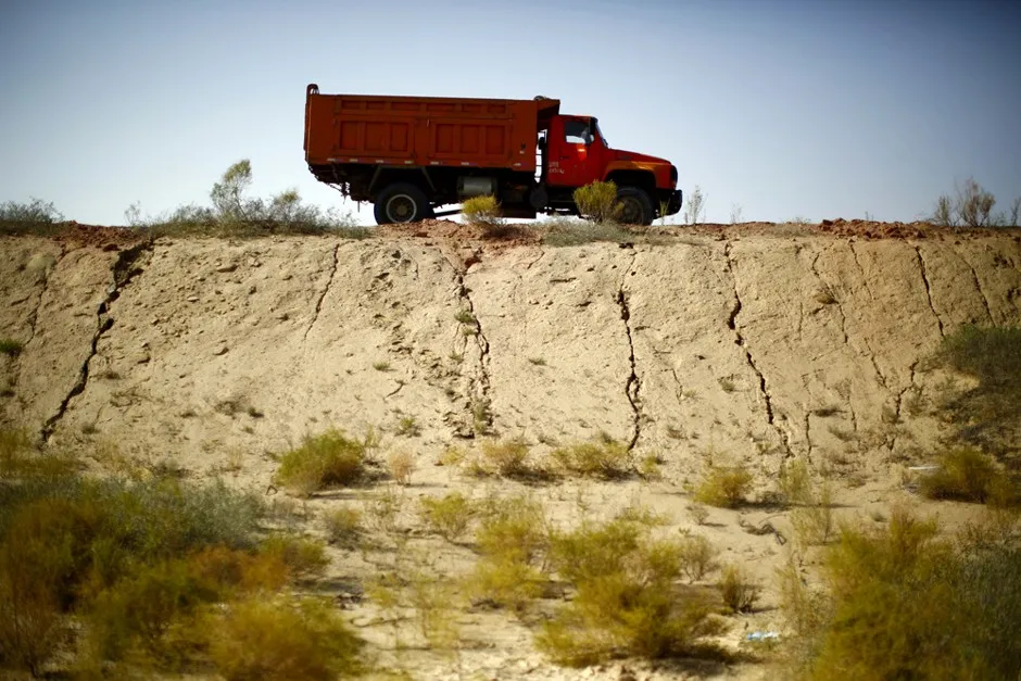 一辆卡车在2013年9月19日甘肃省民勤镇郊区干涸的石羊河附近的道路上行驶。路透社/卡洛斯·巴里亚