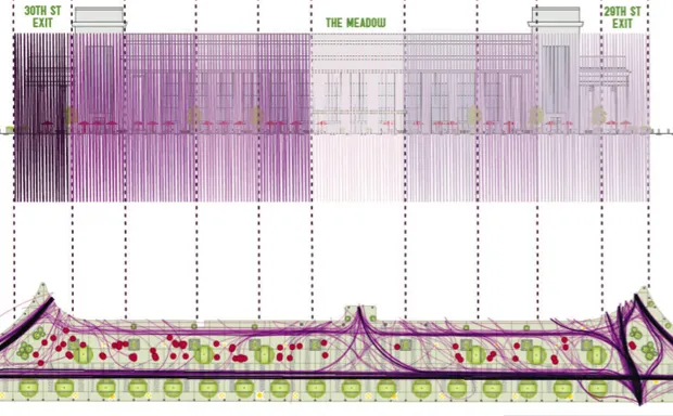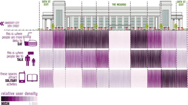顶部的一个结果图表展示了行人流量通过广场的情况——人们往往倾向于聚集在西端——红点捕捉了停留点。走廊的不同部分也常常用于不同的目的,人们在较安静的东端更常寻求独处: