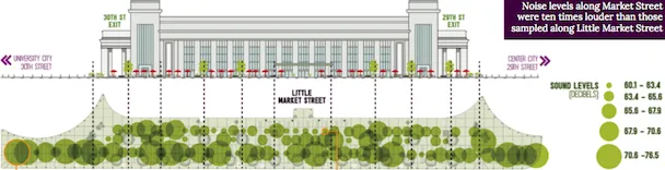 靠近繁忙的市场街测得的噪音水平比紧邻车站的小市场街高出10倍,这部分解释了为什么人们往往不愿意在那儿逗留。更大的噪音(70-75分贝)就像你客厅里的吸尘器,而较小的声音(60分贝)更像是近距离的对话。