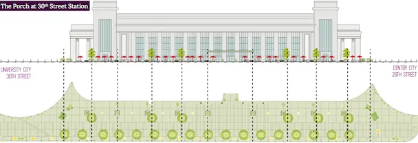 换句话说,如何创造一个可以以两种速度体验的空间——一种是匆忙赶火车的通勤者,另一种是想要停留的读者?如何设计一个在午餐高峰时感觉宽敞,但在上午中段又不显得空荡荡的广场?费城人真正想要的是什么,在城市的“前廊”中:是在热闹人群中的一个座位,还是在边缘观察人群的一个私密角落?