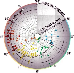 右侧的一个优雅图表显示,随着夏季气温的升高,人们越来越多地转向广场的阴凉处。