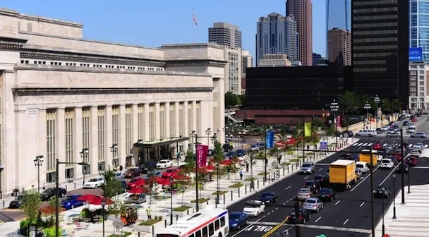 大学城地区在没有训练的眼中,费城30街车站外的露台显然是一个成功。两年前,交通工程师在火车站前铺设了一条车道,创造了一个宽50英尺、长565英尺的宽阔人行道。花费约25万美元,大学城地区组织随后摆放了一些桌子和椅子、花盆和伞,所有这些都没有固定在地面上。