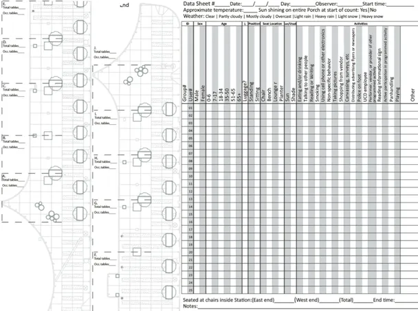 上面的图表给你展示了这个空间的基本布局,树木将其温和地划分为一系列小“房间”。该地点有一名全职礼宾人员负责监督一切(广场也是农贸市场、瑜伽课程、音乐会和其他活动的所在地)。在不断走动的过程中,他帮助收集了去年春夏季节的数据,使用这个调查工具记录天气、行人在广场的位置、他们的大致年龄、是否携带行李并停下来阅读信息标志,或者使用手机: