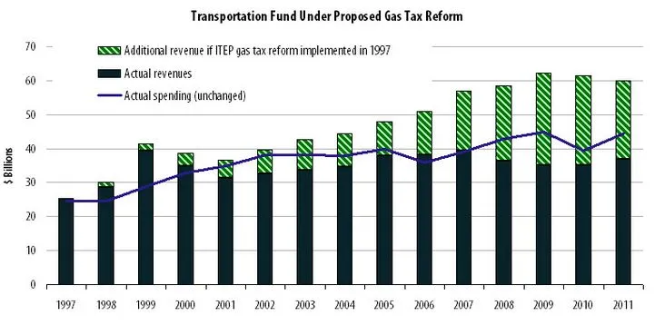 如果政府在1997年实施了这样的政策,到现在可能已经产生了约2150亿美元,ITEP估计。即使扣除从一般基金转移的530亿美元,信托基金仍将有额外的1620亿美元用于改善美国破旧的道路和桥梁或资助资本交通成本。以下是ITEP对今天高速公路信托基金应有样子的愿景:
