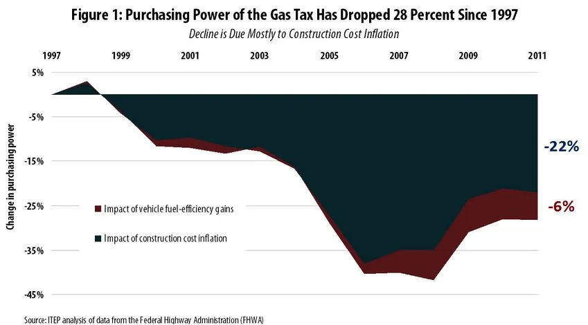 燃油效率和建设成本共同使汽油税的价值(相对于1997年)减少了28%,其中22%归因于建设,只有6%归因于更好的每加仑英里数: