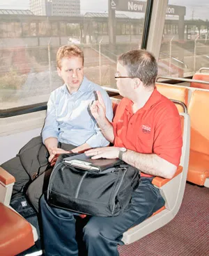 格里利(左)在上班路上接受讲座哈里·古尔德·哈维四世,彭博商业周刊