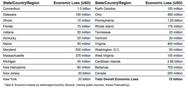 经济面临的威胁也在扩散。企业没有电力,纽约证券交易所关闭了前所未有的两天。总的来说,到2013年5月,分析师估计桑迪在三州地区造成的经济损失达640亿美元,占总成本的89%。