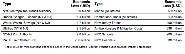 经济面临的威胁也在扩散。企业没有电力,纽约证券交易所关闭了前所未有的两天。总的来说,到2013年5月,分析师估计桑迪在三州地区造成的经济损失达640亿美元,占总成本的89%。