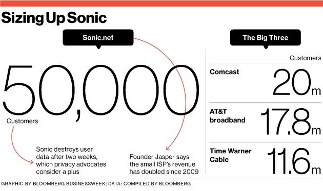 对于AT&T来说,贾斯珀是个长线赌注。他是位于加利福尼亚州索诺玛县的互联网服务提供商Sonic.net的首席执行官,该公司在旧金山、萨克拉门托和洛杉矶大都市区与AT&T竞争。它计划进一步扩展,尽可能使用每秒千兆比特的光纤电缆。在过去的二十年里,Sonic大多数时间是一个安静的地方玩家,但最近因其作为良好互联网服务提供商的形象而获得了一些声誉,提供便宜、快速的连接,迎合科技极客,与 谷歌 和 奈飞 关系友好,并且曾与政府法院命令对抗,要求提供支持维基解密的客户的数据。“丹是个极客,”隐私研究员和活动家克里斯托弗·索戈汉说。“他是我们中的一员。”