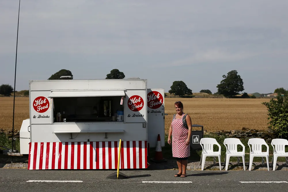 丹尼,51岁,2013年8月22日在英格兰北部牛顿附近的A69公路上,他的零食拖车旁摆姿势拍照。路透社/斯特凡·维尔穆特