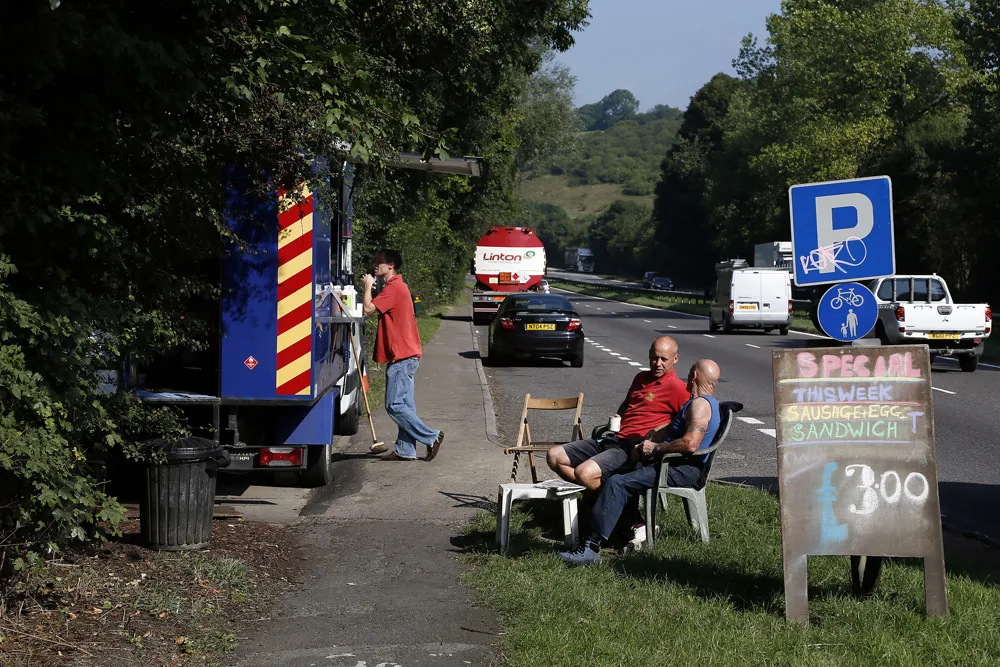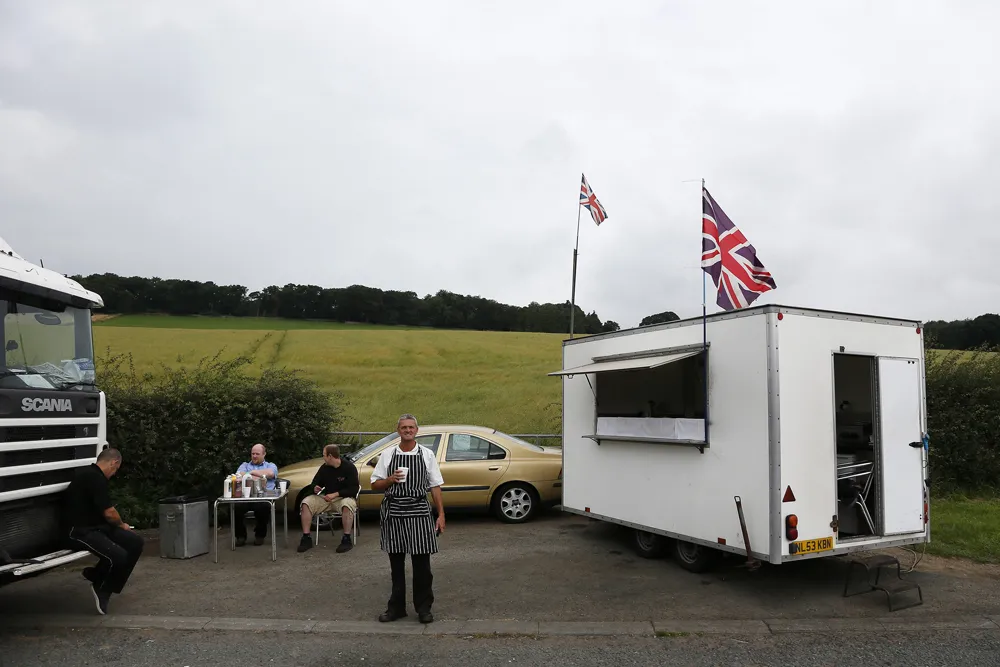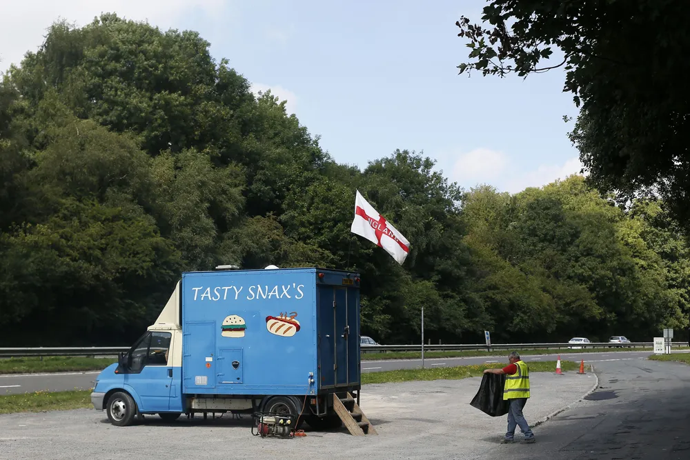 一名卡车司机走向位于英格兰南部凯特汉姆附近A22公路上的小吃车,2013年9月4日。路透社/斯特凡·维尔穆特
