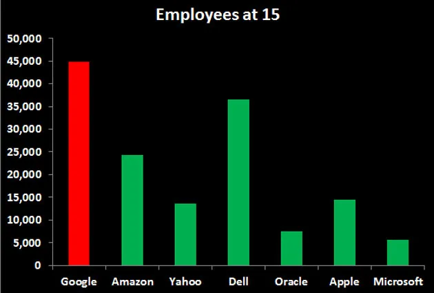 最后,在员工数量上,谷歌再次排名第一,员工人数超过所有其他15岁公司: