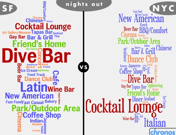 查看这张每个城市前40个“外出”目的地的图形,我们看到旧金山更喜欢潜水酒吧,而纽约则更喜欢鸡尾酒酒廊。根据Kubal的说法,每个城市的chronos用户去他们偏好的地方的频率几乎是另一个城市的两倍。外出用餐时,纽约人倾向于选择意大利和希腊餐厅、牛排馆和餐馆,而旧金山人则选择拉丁和印度餐厅以及墨西哥餐馆。撇开食物和饮料不谈,旧金山人更倾向于去公园、朋友家、音乐会和体育赛事,而纽约人则更可能出现在夜总会中。