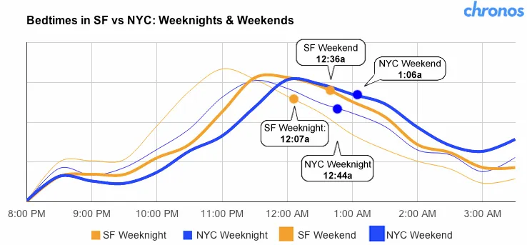 然而,后续图表显示,纽约的平均工作日晚上就寝时间——凌晨12:44——比旧金山晚37分钟,甚至比旧金山的平均周末就寝时间还要晚。