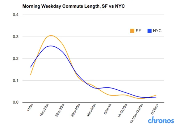 尽管纽约人在工作日通常起得较晚,但两座城市的通勤时间看起来相当相似,大多数都在30分钟以内。纽约人在10分钟以内的通勤次数略多,但在50分钟以上的通勤次数也更多。