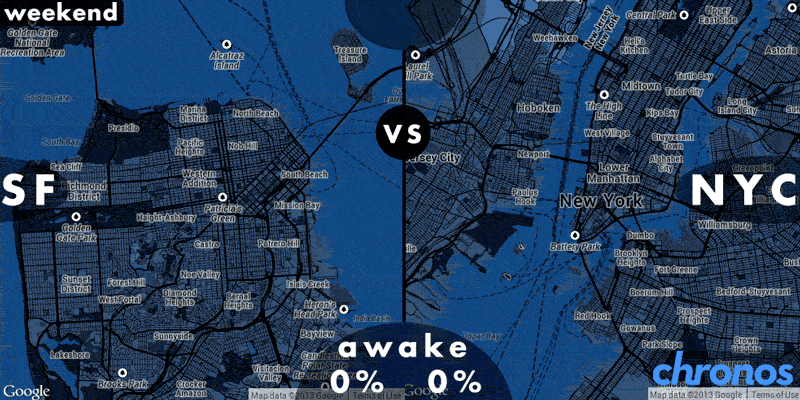 Charlie Kubal 和 Dylan Keil 是 chronos 的联合创始人,这是一款利用位置和加速度计数据来追踪人们如何花费时间的移动应用。用户无需手动输入他们去过的地方,但可以确认应用正确记录的活动,并在应用记录错误时进行修改。使用来自每个城市数千名随机选择用户过去六个月的数据,chronos 的创始人 比较了纽约人和旧金山人的睡眠、通勤和夜生活模式。
