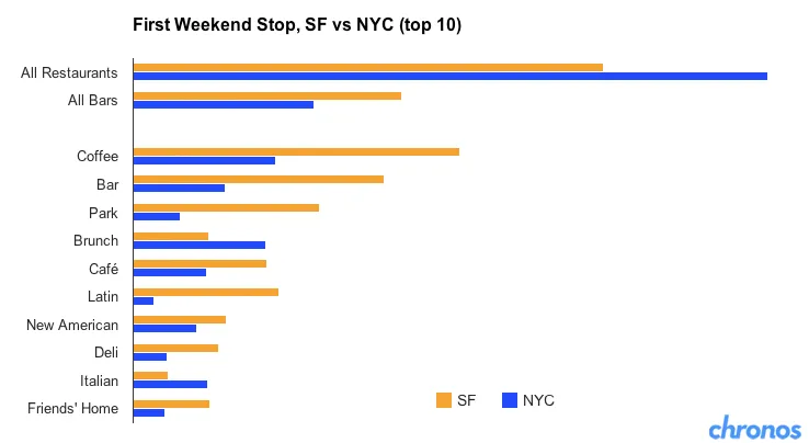 那么悠闲的周末早晨呢?下面的图表显示,旧金山人起床后去喝咖啡(超过25%的第一站是咖啡店),而纽约人则去吃早午餐(餐馆占第一站的超过一半,其中相当一部分是专门的早午餐场所)。
