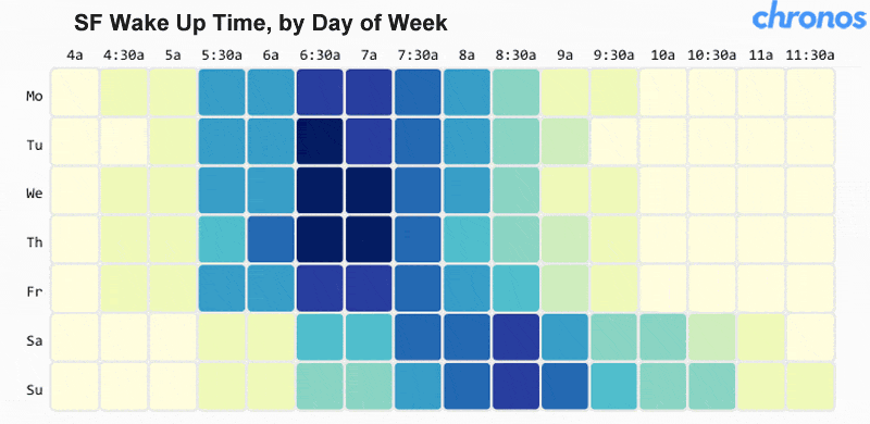 在这张工作日醒来的时间热图比较中(以当地时间显示),旧金山似乎比纽约早起。实际上,旧金山的平均醒来时间是早上7:30,而纽约是早上7:47。