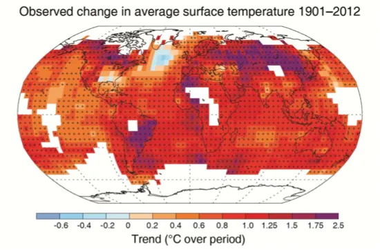 这张来自IPCC第五次评估的图表显示了过去一个世纪的全球变暖情况。