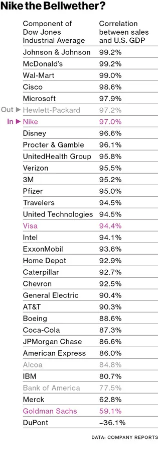 自1990年以来,耐克的销售与美国国内生产总值的相关性比道琼斯其他五个成分股(强生、麦当劳、沃尔玛、思科系统和微软)的销售更为密切。