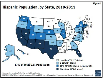 值得关注的州是亚利桑那州、加利福尼亚州、科罗拉多州、佛罗里达州、内华达州、新泽西州和德克萨斯州——这些州的西班牙裔人口占总人口的20%以上。