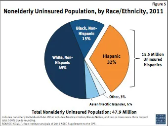大约1550万西班牙裔没有健康保险。这大约占美国总无保险人口的32%,如果不包括老年人。