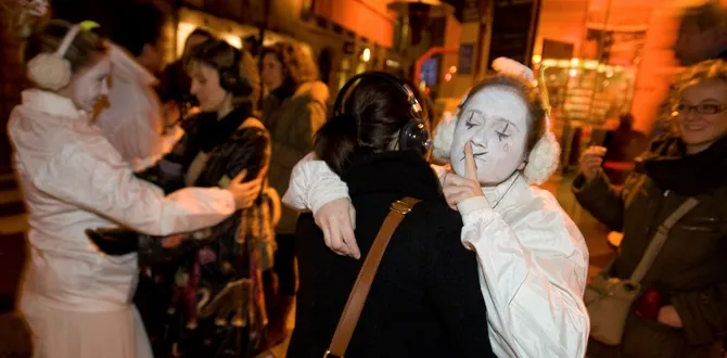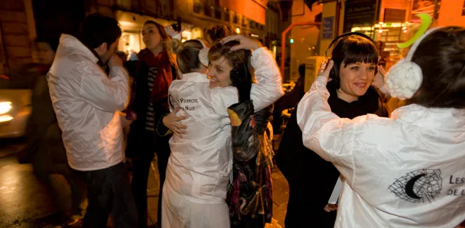 自去年三月以来,这群沉默、面带忧伤、身穿黑白服装的调解者在周末的夜晚潜行于城市繁忙的酒吧街,温柔地鼓励人们以较低的音量饮酒、吸烟和聊天。通常他们从不说话(尽管有分发传单的“调解者”跟随),小丑们的口号不容易简洁地翻译:“创造氛围而不提高音量。”他们的领导向Le Bonbon Nuit杂志解释了他们的意图:
