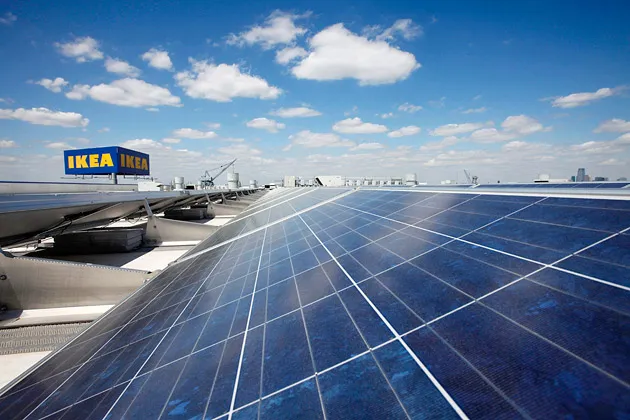 太阳能电池板排成一行,位于宜家的布鲁克林(纽约)商店,时间是2011年4月摄影:马克·伦尼汉/AP 图片在英国的宜家商店,顾客很快就能在购买平板家具的同时,储备屋顶太阳能电池板。