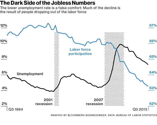 在9月18日,伯南克淡化了他在6月提出的7%的缩减阈值,称失业率“并不一定是衡量就业市场的好指标”。他甚至暗示6.5%的加息水平可能太高。“委员会还会考虑劳动市场状况的其他指标,”伯南克说。“短期利率的首次上调可能要等到失业率显著低于6.5%时才会发生。”