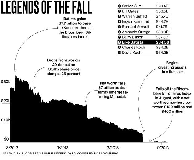 说巴蒂斯塔过于自信将严重低估在那场自我陶醉的媒体盛会和魔幻思维之后的18个月里发生的事情。在这场可能成为历史上最大个人和金融崩溃之一的过程中——如果不是最大的——巴蒂斯塔可能正接近破产。10月1日,OGX未能支付4500万美元的债券利息,这是他在崛起过程中积累的债务。巴蒂斯塔已经出售了他的飞机和直升机,债权人正在争论他公司的残余资产。他不再出现在彭博亿万富翁指数上,成为巴西人笑话的对象。有一个笑话说教皇方济各计划很快返回巴西,并将再次探访穷人,包括巴蒂斯塔。