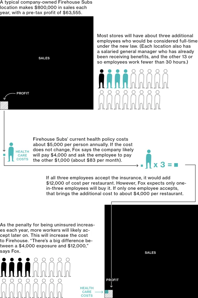 Firehouse Subs, 美国增长最快的餐厅连锁,拥有超过660家公司自营和特许经营的餐厅,不打算减少员工的工作时间。但首席执行官Don Fox确信,来自平价医疗法案相关成本的压力将减缓新三明治店的快速扩张。“这不是是否会减缓他们的问题,”他谈到这项医疗法案时说。“这只是程度的问题。”Fox补充说,花在健康福利上的美元是本可以用于新地点的美元。