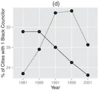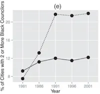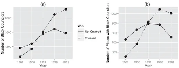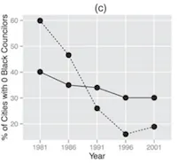 从图形上看,这些研究图表展示了过去一代人中两种截然不同的轨迹:在未受第五部分覆盖的地方,黑人在市议会的提升缓慢(有时甚至下降),但在受覆盖的地方,他们却经历了巨大的提升: