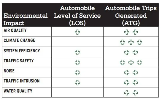 几年前,为了准备自己从LOS的地方性脱离,旧金山县交通管理局进行了ATG的全面研究。相对优势显而易见:ATG是环境影响的优越指标,与“公共交通优先”政策一致,并导致系统范围内(而非交叉口特定)的缓解措施[PDF]. 该指标在七个关键的CEQA标准上优于LOS: