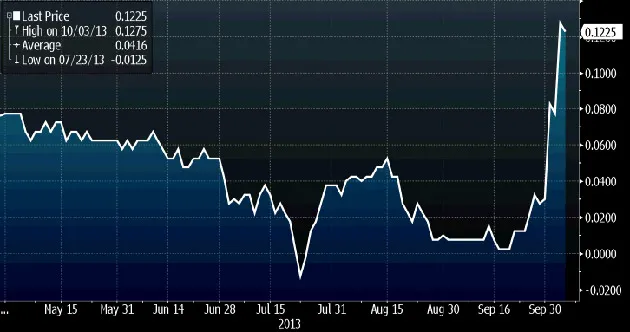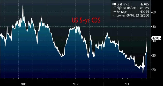 即将到来的市场反应的震动开始在债券市场显现。到10月17日到期的美国债务收益率——财政部现金耗尽的同一天——在过去一周内急剧上升(见上图)。美国债务的信用违约掉期价格也大幅上涨,自9月19日以来已翻倍。