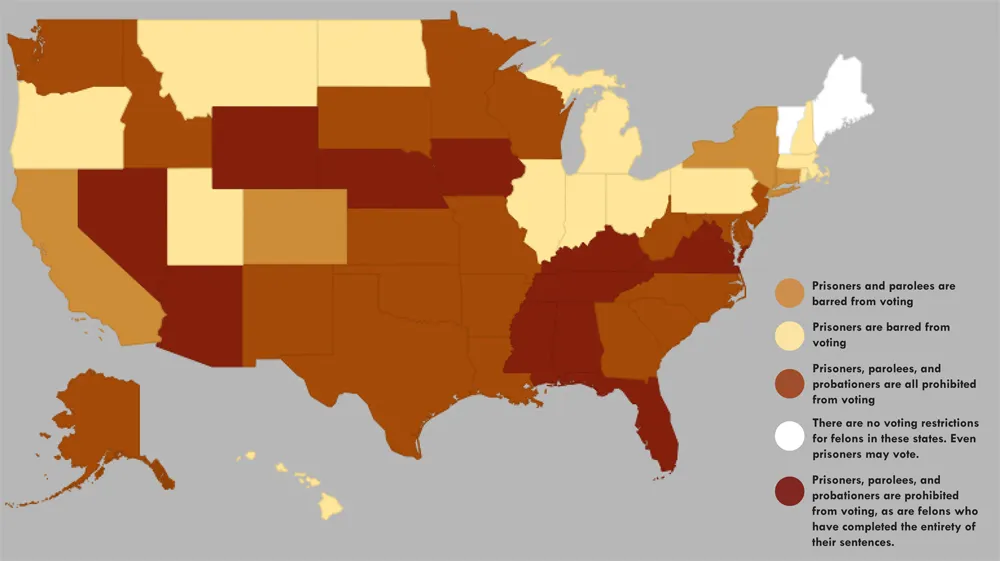 目前,7.7%的成年非裔美国人群体,或每十三人中就有一人,失去了选民资格。这个比例是非非裔美国人群体1.8%比例的四倍。在三个州,至少每五名非裔美国成年人中就有一人失去选民资格:佛罗里达州(23%)、肯塔基州(22%)和弗吉尼亚州(20%)。在全国范围内,220万非裔美国人因与刑事司法系统的关系而失去选民资格,其中超过40%的人已完成其刑期。