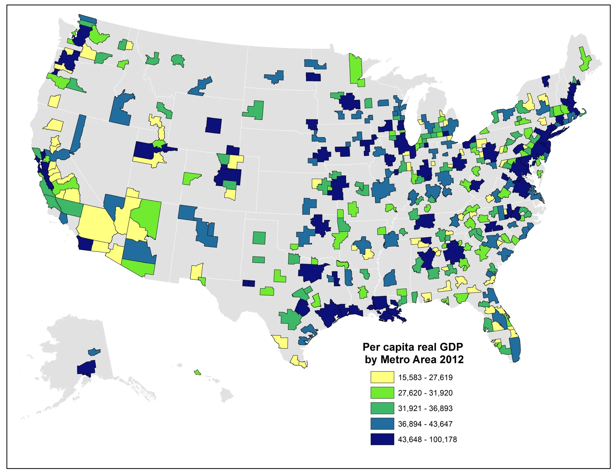 另一方面,生产力最低的城市集中在阳光带,主要在佛罗里达州、亚利桑那州和德克萨斯州。2012年生产力最低的五个城市是佛罗里达州的村庄;亚利桑那州的哈瓦苏湖市-金斯曼;佛罗里达州的塞布林;德克萨斯州的麦卡伦-埃丁堡-米申;以及佛罗里达州的庞塔戈尔达。在人口超过一百万的大城市中,加利福尼亚州的河滨-圣贝纳迪诺-安大略是唯一一个人均实际GDP低于30,000美元的城市。