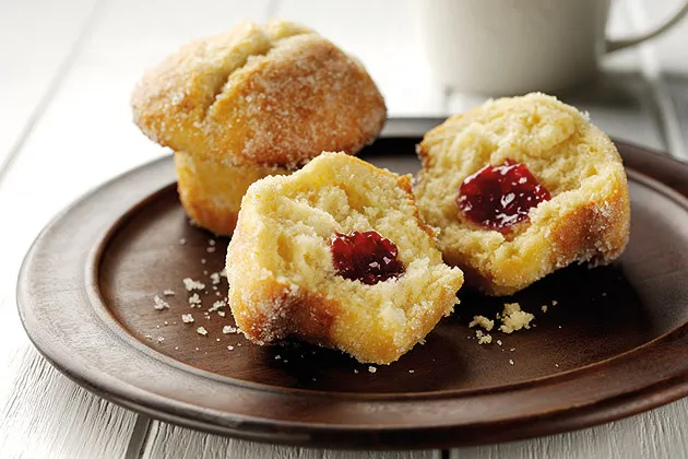 杜芬使用黄油牛奶作为基础,味道像湿润的蛋糕松饼,而不是粗糙的面包类型。它看起来像一个松饼,但里面填充了覆盆子果酱,并裹上了糖,就像一个 果酱甜甜圈。吃杜芬非常麻烦,不适合那些太过优雅而不愿意擦或舔手指上糖晶块的人。