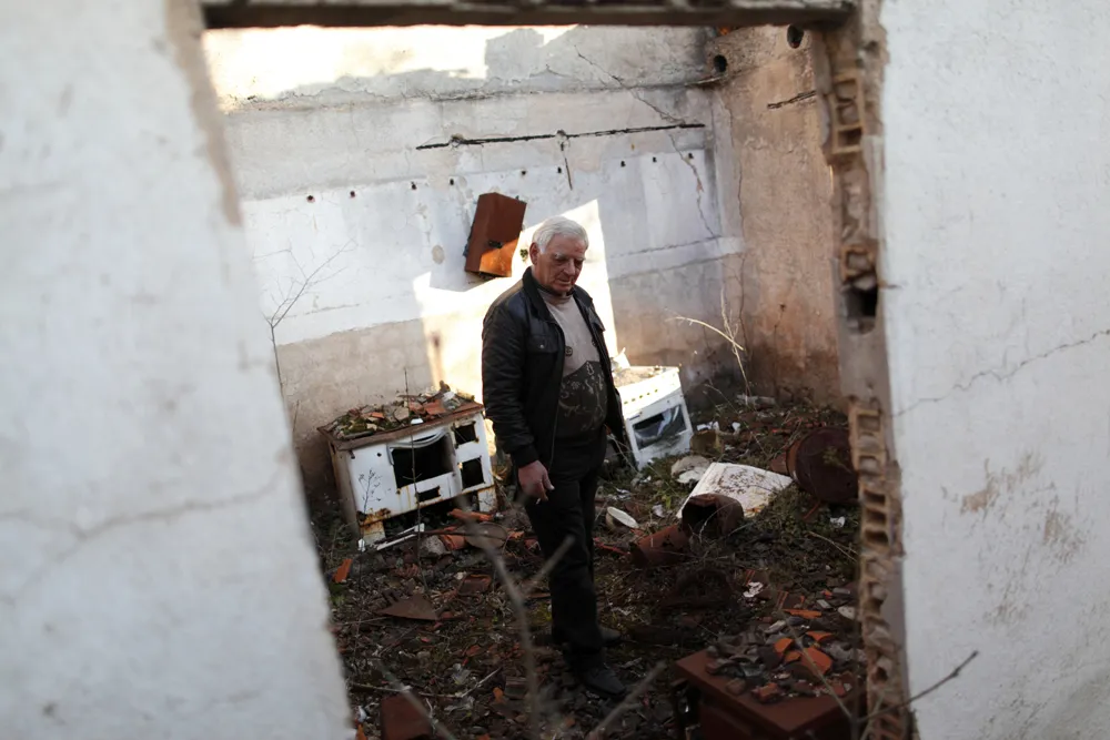 克罗地亚塞尔维亚人萨瓦·克涅泽维奇,65岁,2013年2月19日在克宁他被毁房屋前摆姿势。克涅泽维奇在邻近的旧谷仓里住了17年,等待房屋重建。他靠出售废弃塑料瓶勉强维持生计,唯一的财物是一张小床和一个木炭炉。克罗地亚战争结束后,克罗地亚当局承诺给予剩余或返回的塞尔维亚人平等的重建战争损坏财产的援助。但在冲突结束18年后,许多人仍在勉强维持基本或临时的生活安排。路透社/安东尼奥·布罗尼克