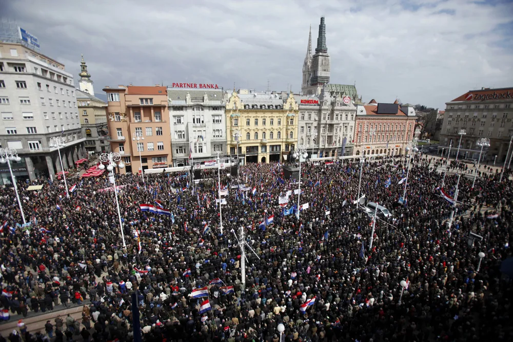 2013年4月7日,扎格雷布主广场上的抗议活动全景。约有20,000名克罗地亚人,主要是退伍军人,周日在首都扎格雷布的中央广场集会,抗议计划引入塞尔维亚人使用的西里尔字母标志。路透社/安东尼奥·布罗尼克