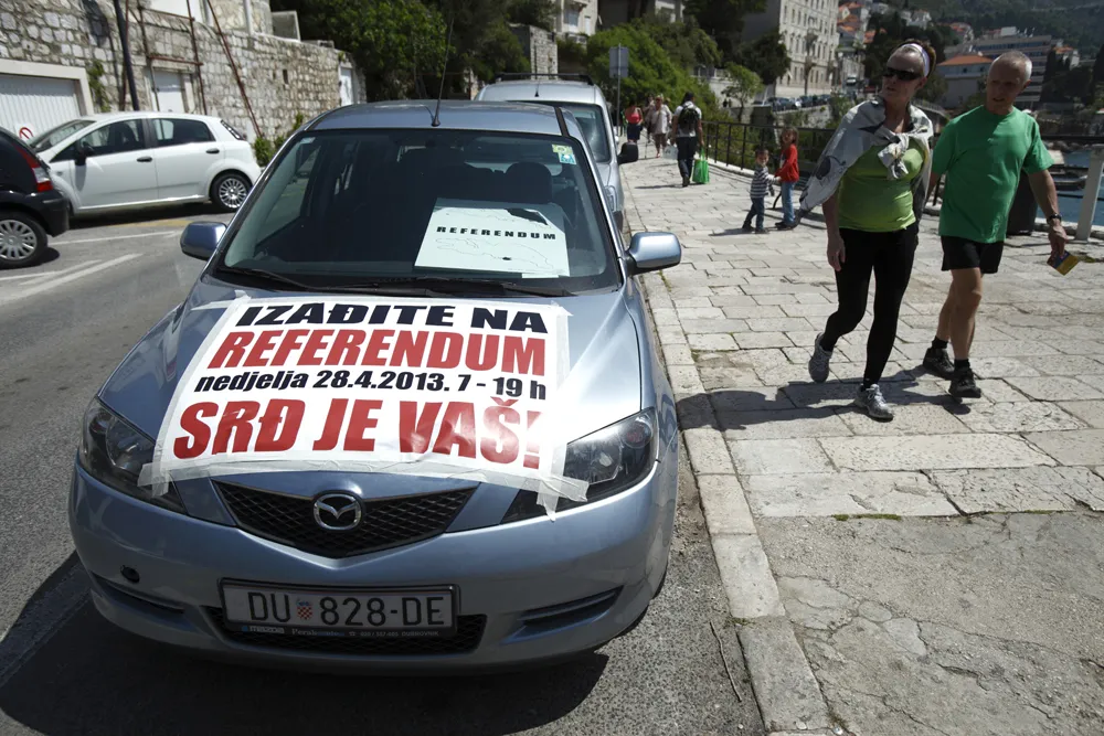 人们在2013年4月28日克罗地亚联合国教科文组织保护的中世纪城市杜布罗夫尼克看着一辆车上的标志。俯瞰中世纪城市杜布罗夫尼克的荒凉斯尔德高原是房地产开发商的梦想,提供了克罗地亚顶级旅游目的地的壮丽景色。标志上写着:“请在公投中投票,2013年4月28日星期日,7点到19点。斯尔德是你的。”路透社/安东尼奥·布罗尼克