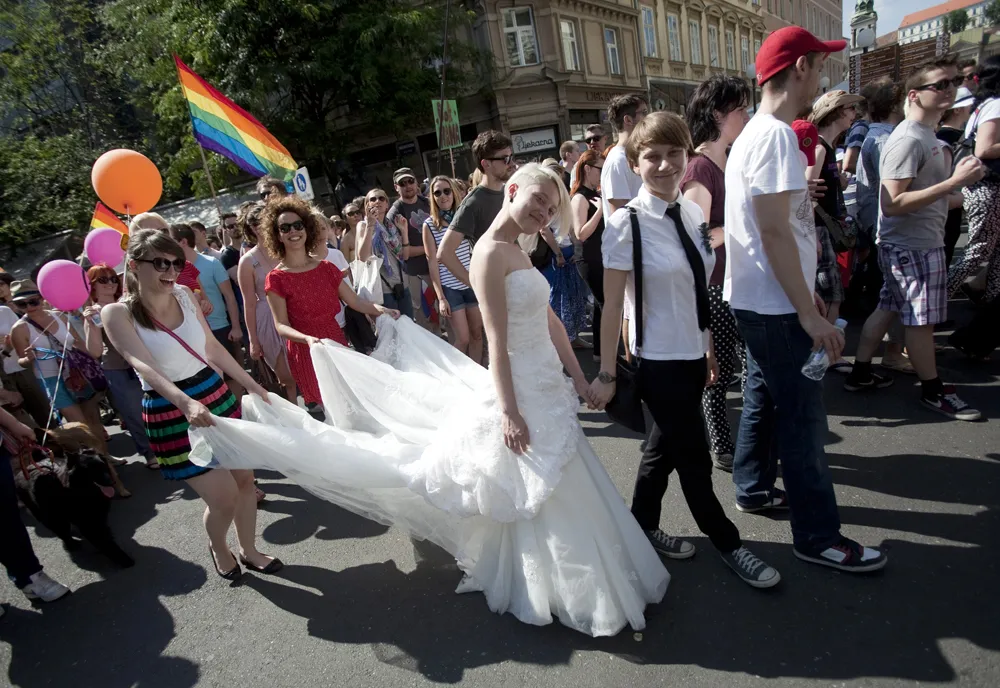 参与者在2013年6月15日的扎格雷布骄傲游行中打扮成婚礼夫妇。当地媒体称,约有15,000名参与者参加了扎格雷布的第12届同性恋骄傲活动。路透社/安东尼奥·布罗尼克