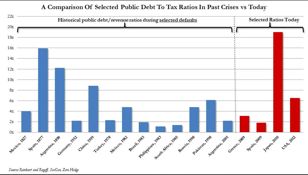 日本最近几个月一直在出现贸易逆差,而该国的经常账户盈余在八月份达到了创纪录的低点。这引发了人们对该国未来承担沉重政府债务负担能力的担忧。根据一种衡量标准——债务与税收收入的比率——日本确实独树一帜,构成的违约风险远大于美国。