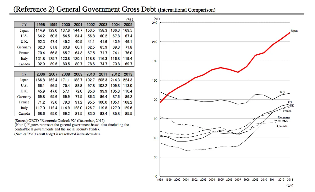 然而,有一个国家让美国看起来像是节俭的典范:日本,其债务负担相对于经济规模而言,远远超过任何其他主要工业化国家。看看日本财政部的这张图表。