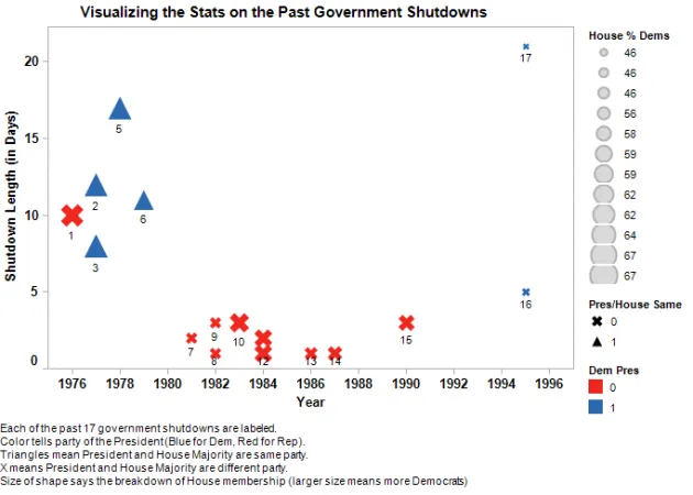 你可以在图表中看到:蓝色形状(民主党总统)显示的停摆时间远长于红色形状。