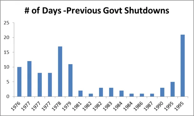 自1976年修订预算流程开始以来,我们经历了17次之前的停摆。这张图表显示了每次停摆的持续时间和发生年份。最长的是1995年12月到1996年1月的停摆,持续了21天。