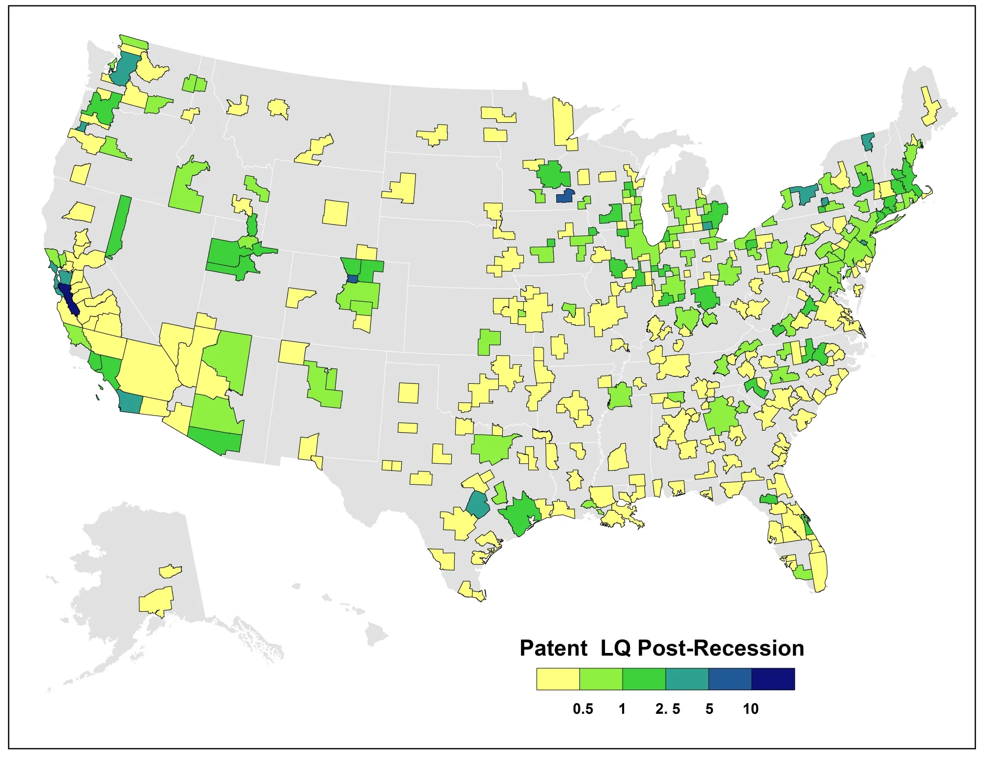 尽管全国范围内的创新步伐总体上波动不定,但创新的具体地理分布在危机和复苏过程中保持相对稳定。湾区——尤其是硅谷——仍然是全国无可争议的领导者,创新在这些知识中心高度集中。而从相对基础(以地点商数为标准)来看,博尔德和安阿伯等领先的大学城则表现突出。