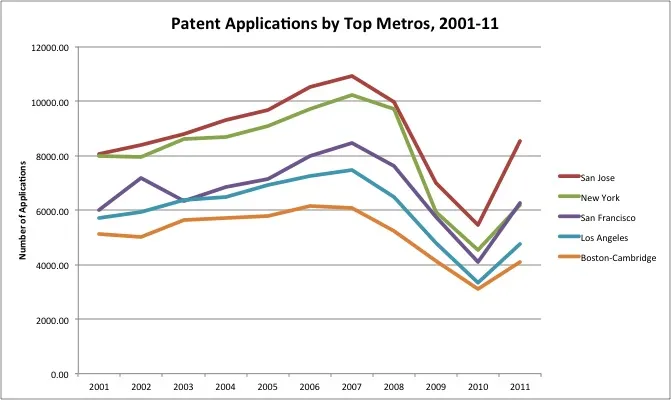 上面的图表显示了五个主要专利城市——圣荷西、纽约、旧金山、洛杉矶和波士顿——从2001年到2011年的趋势。这五个城市在这一十年中占据了专利申请的30.2%。这五个城市都模仿了全国趋势,从2008年到2010年有明显的下降,然后在2011年有所回升。但是,图表还显示圣荷西在其他城市中逐渐领先。旧金山的复苏也比纽约、洛杉矶或波士顿-剑桥更为显著,这从其2010年至2011年间更陡峭的最终段落可以看出。
