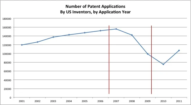 下面的图表由 德博拉·斯特朗斯基提供,她是北卡罗来纳大学夏洛特分校的专利和创新领域的领先专家,从 2001 年到 2011 年对专利申请的创新模式进行了实证研究。斯特朗斯基使用了专利申请,因为时间还不够长,无法记录已接受的专利(两者高度相关)。尽管存在局限性,经济学家仍将专利作为创新的标准衡量指标。